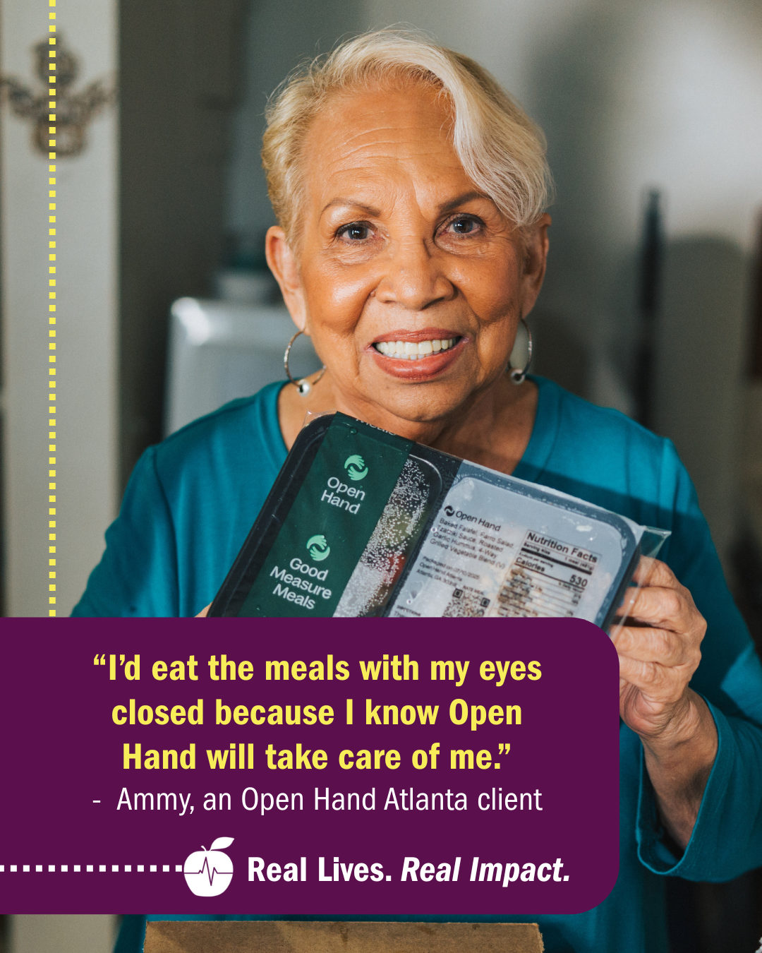 After multiple rounds of chemotherapy, Ammy lost feeling in her fingers, and cooking became dangerous. “Everything tasted like paper,” she said. “The first thing I could taste again? Open Hand Atlanta. I’ll never forget.”